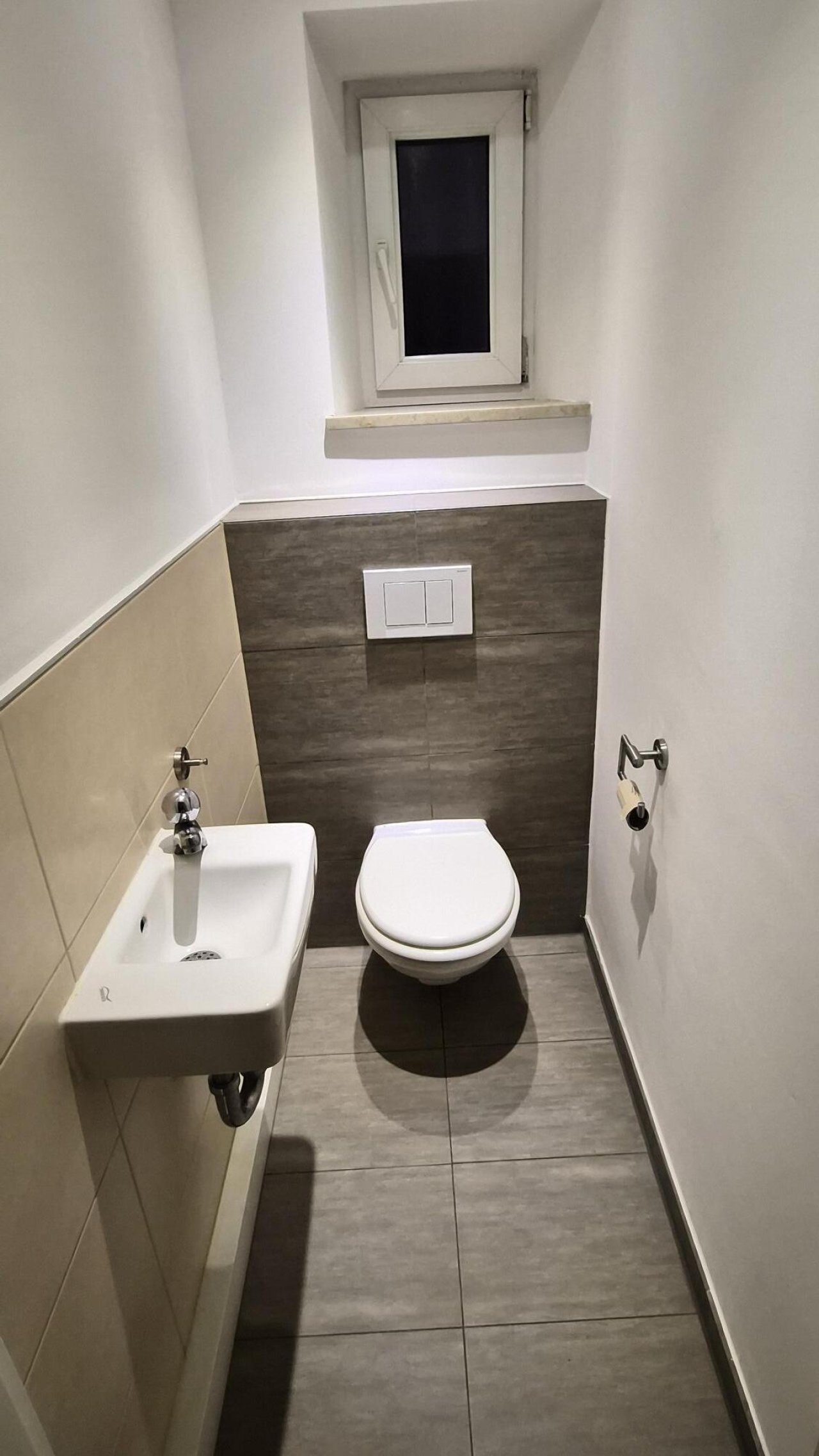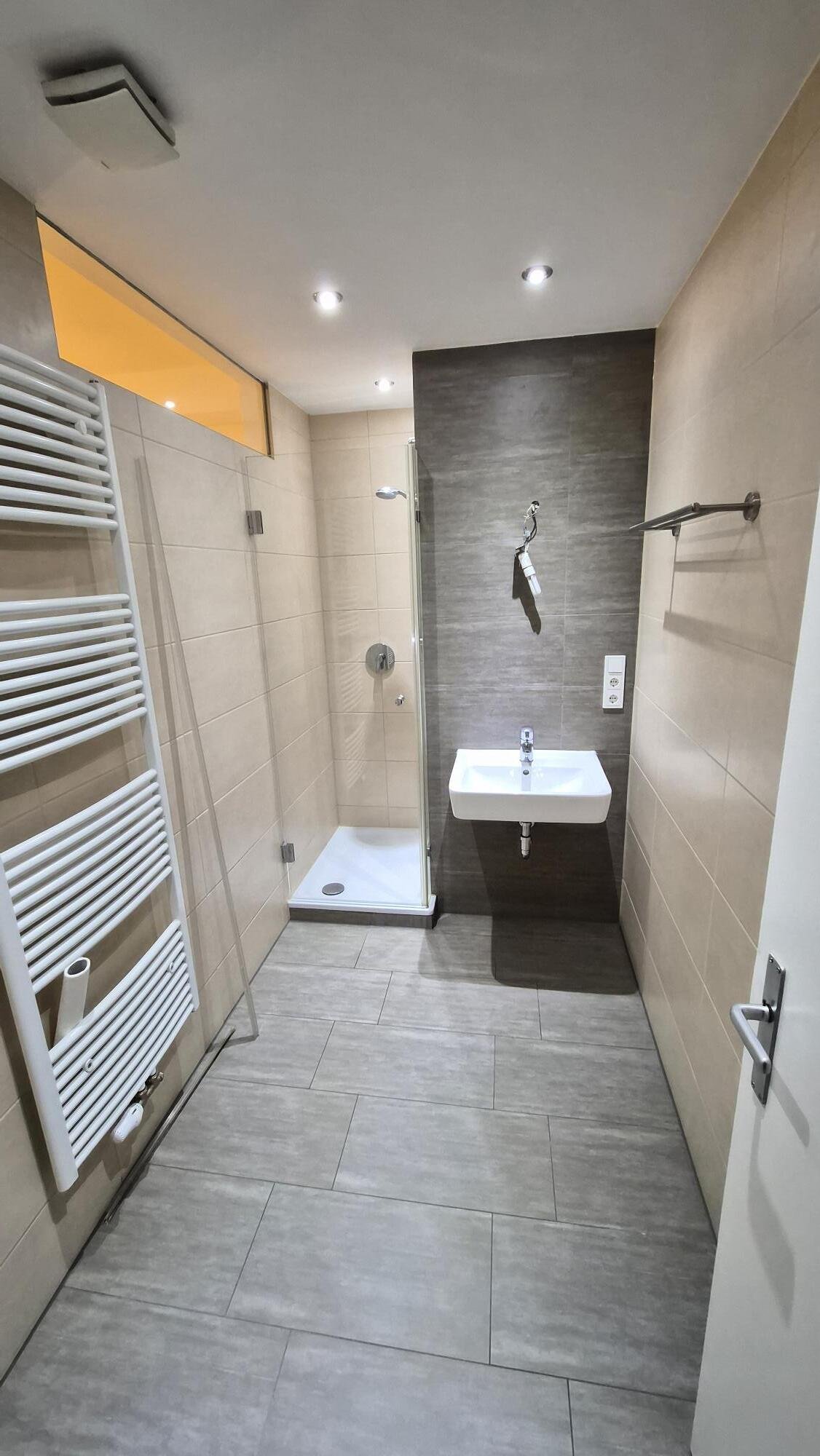 Modernes Badezimmer mit Dusche, geschmackvollen Fliesen sowie einem praktischen Handtuchheizkörper. Ergänzt wird es durch ein separates, gefliestes WC.