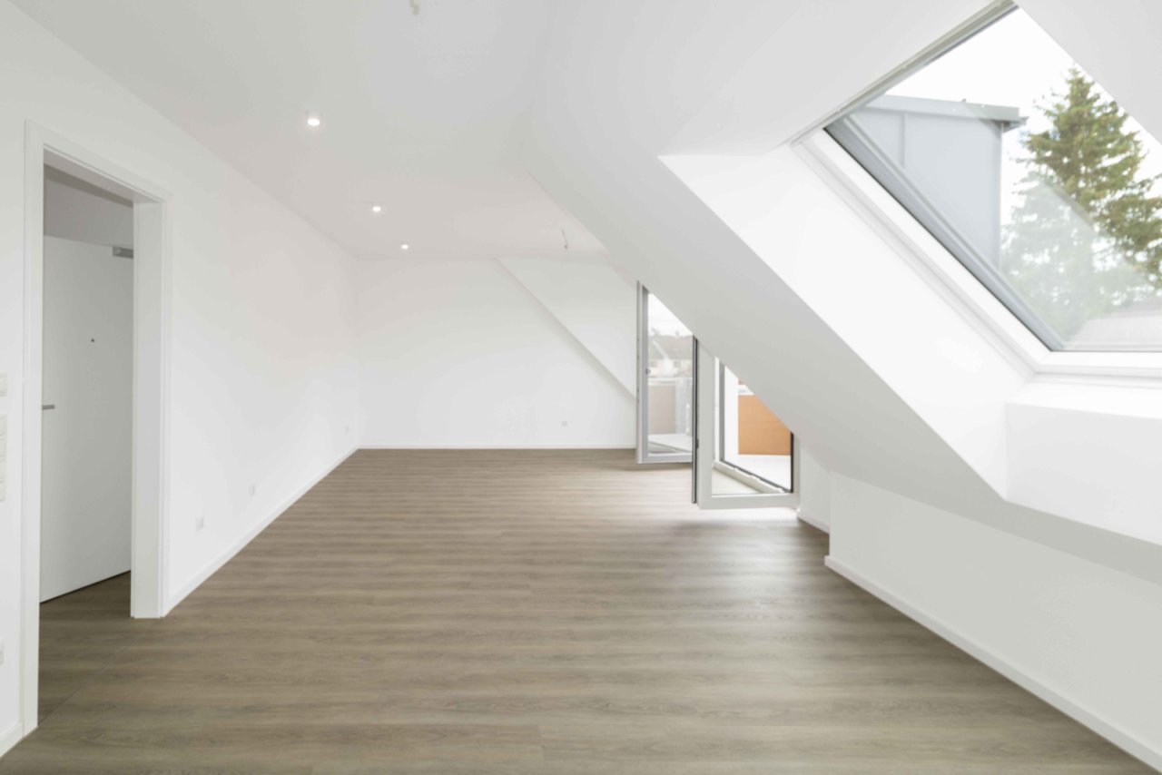Die Dachgeschosswohnungen sind über eine Auszugstreppe mit einem ausgebauten Dachspitz verbunden, der praktischen zusätzlichen Stauraum bietet.
