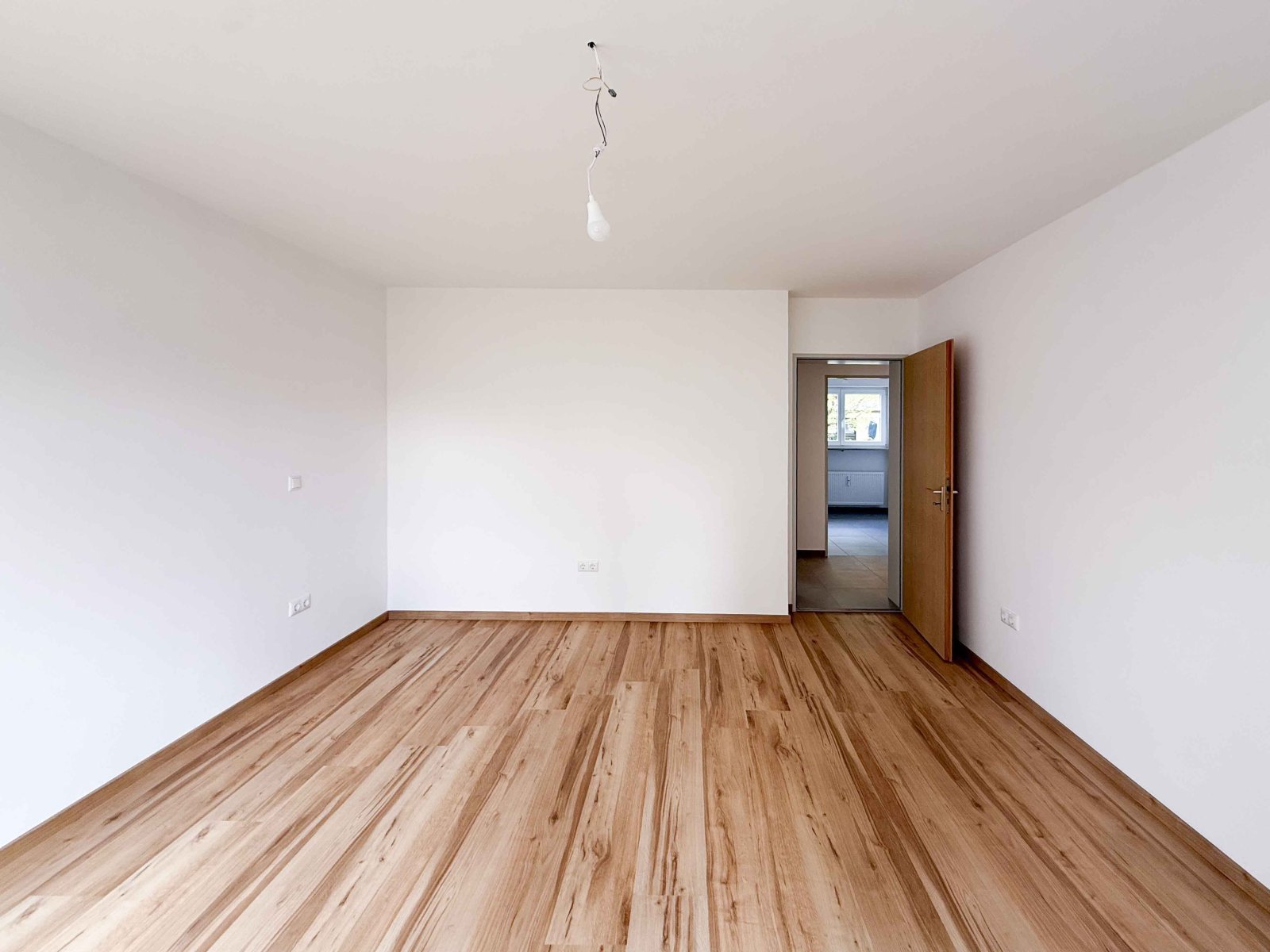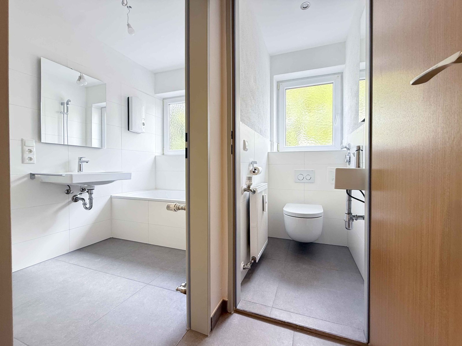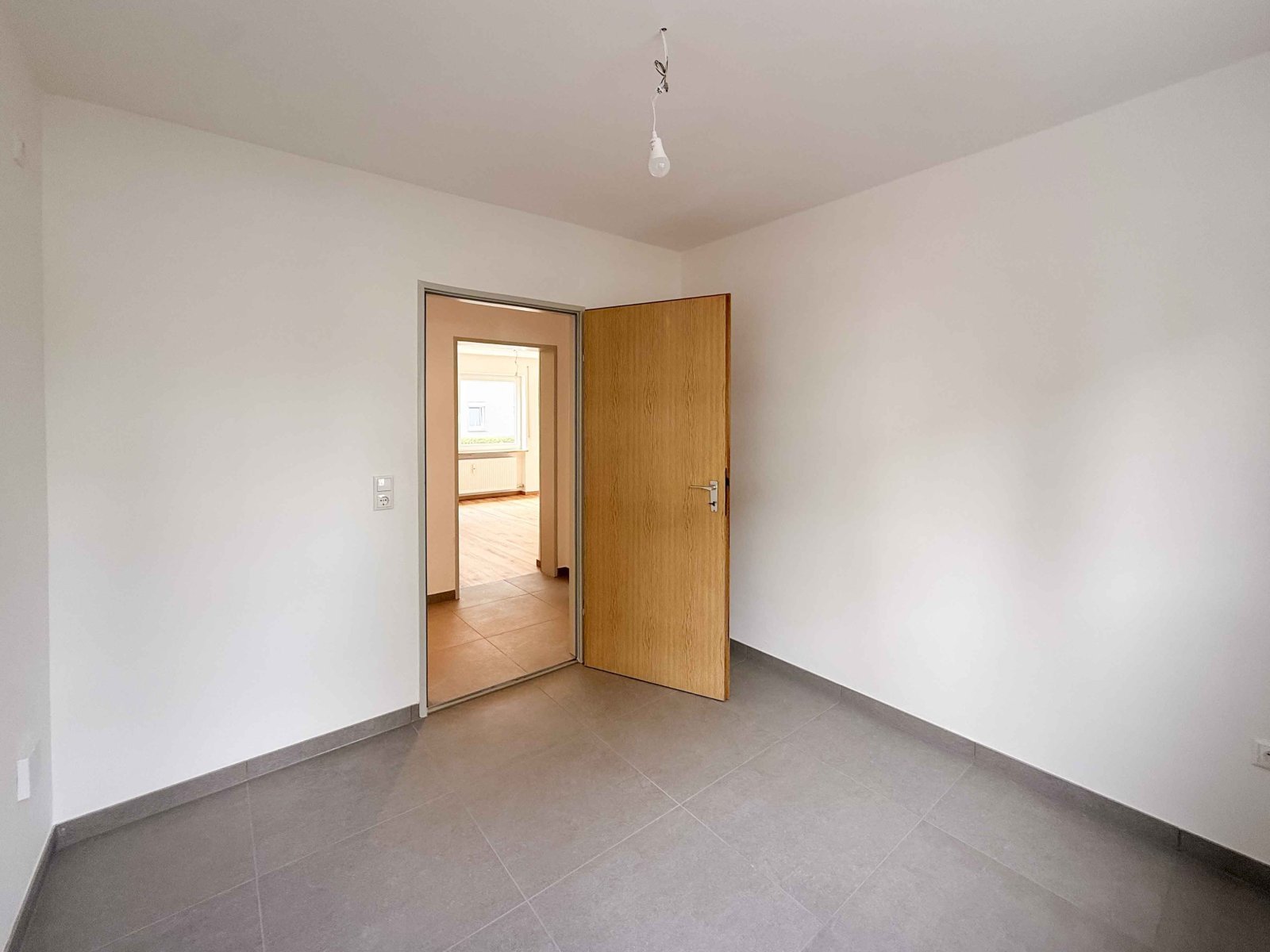 Der großzügige Wohnbereich sowie die beiden Schlafzimmer sind mit einem hochwertigen Vinylboden ausgestattet, der für eine warme und wohnliche Atmosphäre sorgt. Flur, Badezimmer und Gäste-WC präsentieren sich mit modernen, dunkelgrauen Steinfliesen und verleihen der Wohnung ein elegantes und zeitloses Erscheinungsbild.
